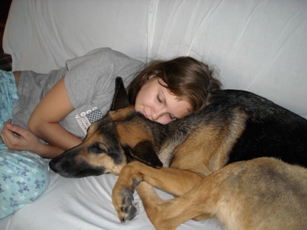 But, they have a big German shepherd dog named Axel whom she loves dearly, and she can't stay away from him as the picture clearly shows.